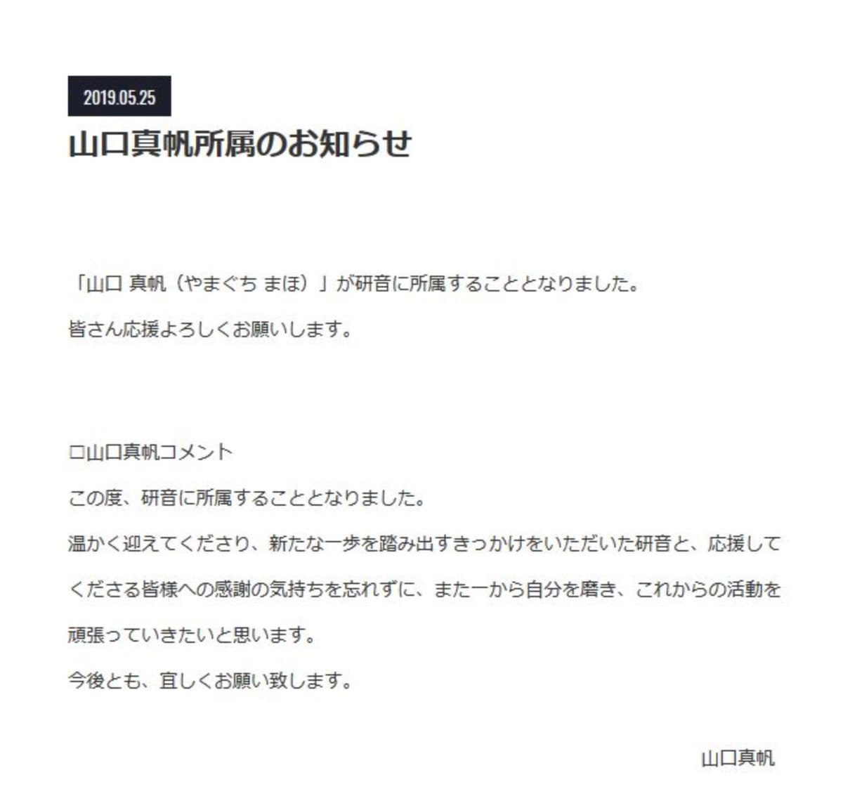 元 NGT48 #山口真帆 さんのコメントが載った大手事務所の研音のホームページがアクセス過多でパンク。スクショ、こちらに貼っておきます。