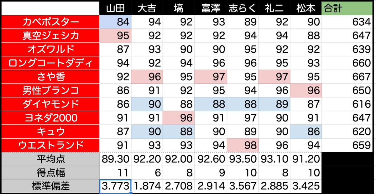 M-1グランプリの7人の審査員の得点票。「標準偏差」は点数のバラツキを表します。 前半は山田邦子さんの得点のバラツキがすごかったんですが、最終的にそこは収まり山田さん、志らくさん、松本さんが得点差をつける結果に。ほぼ得点の差をつ…