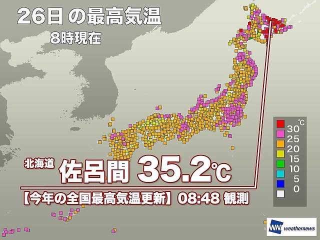 極めて危険な暑さになります. 明日26日は季節がおかしくなってしまったかのような気温予想.最高気温は福島36℃を筆頭に熊谷・宇都宮・前橋・甲府・岐阜・京都・豊岡・日田35℃,そしてまさかの北海道でも帯広・北見35℃と各地で猛暑日に…