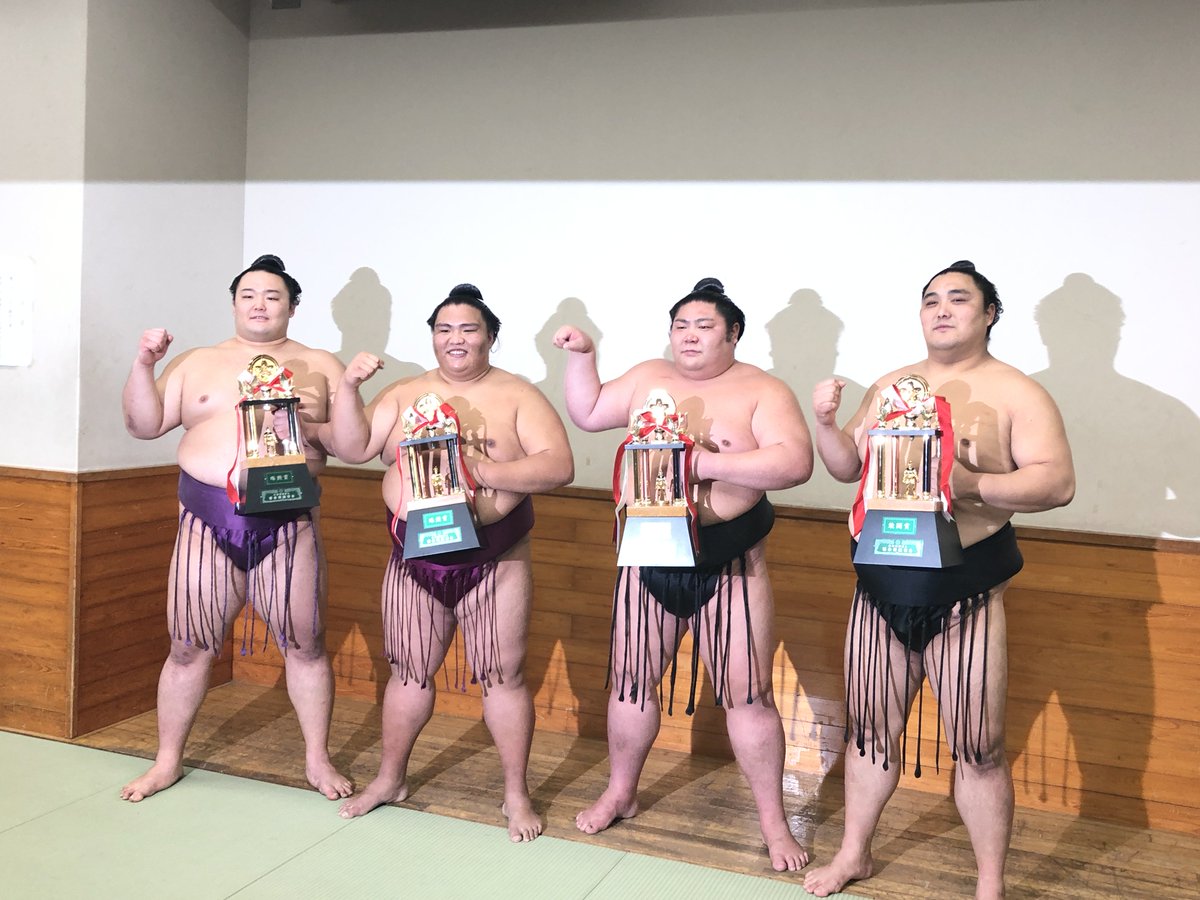 <千秋楽の様子>三賞受賞力士による記念撮影。殊勲賞の朝乃山と御嶽海、敢闘賞の剣翔と隠岐の海。 #