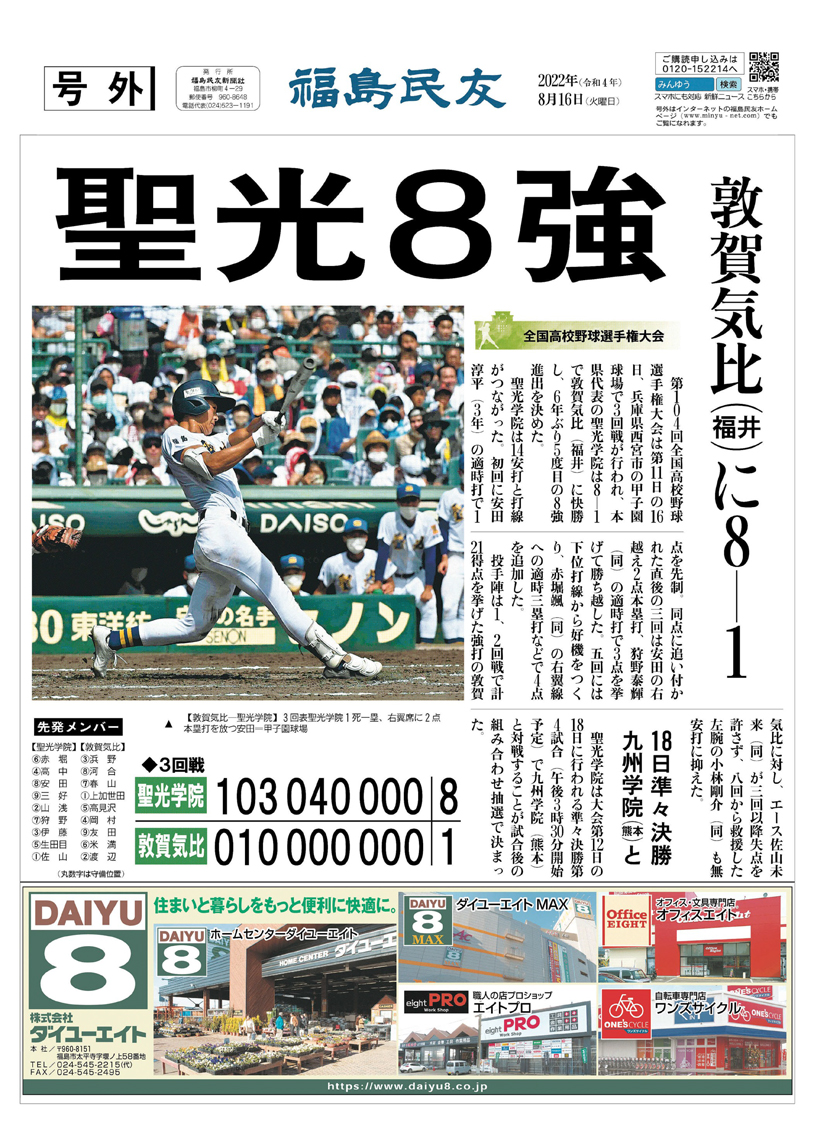 【号外】聖光が6年ぶり8強 夏の甲子園、敦賀気比に8-1 #高校野球 #夏の甲子園 #聖光学院 #敦賀気比 #福島県 #福島民友新聞
