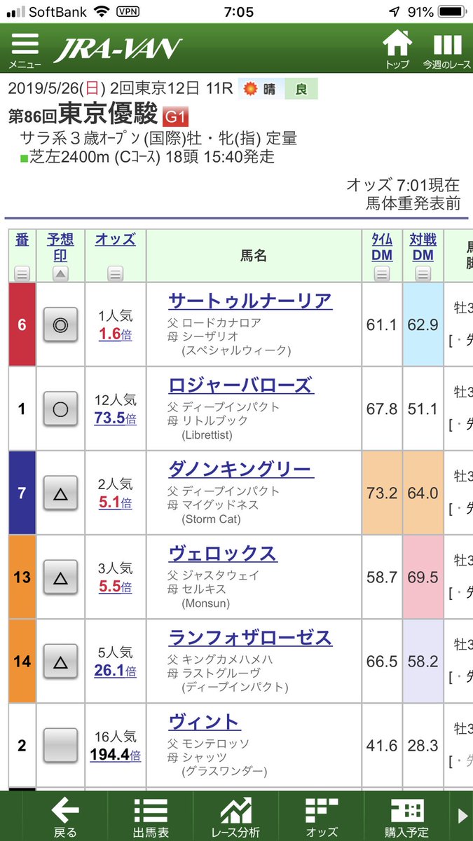 本日15時40分に日本ダービー発走予定です。私は1着を「サートゥルナーリア」と予想します。前走では皐月賞を制覇し過去レースで4戦4勝と勢いがあります。日本ダービーを制覇して無敗の2冠を達成してもらいたいですね。今度こそ予想を的中さ…