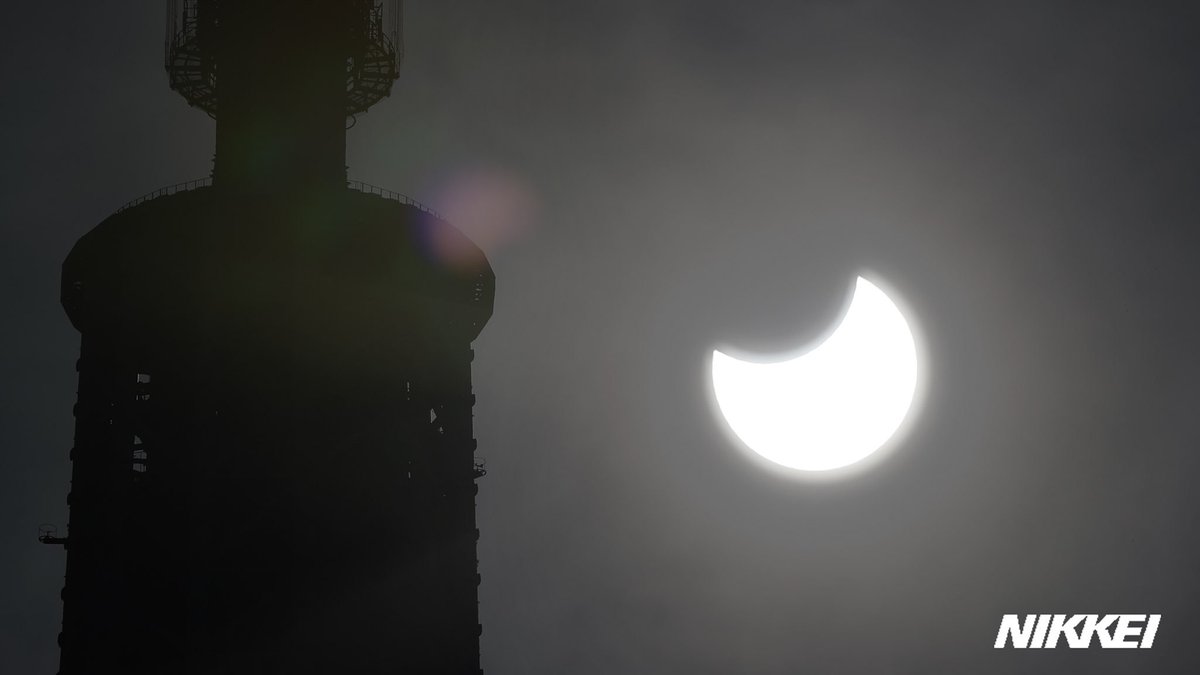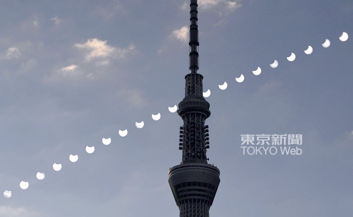 月が太陽の前を横切る「部分日食」が東京都内で観測されました。午前10時過ぎに最も大きく欠け、3割ほど欠けました。東京スカイツリーとの合成写真です(今)#日食
