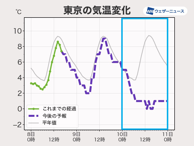 <10日日中の東京は極寒> 10日(木)は関東で雪が降り、真冬のような厳しい寒さになります。東京の最高気温は日付が変わってすぐの夜中に出る予想で、日中は0℃台で経過する予想です。
