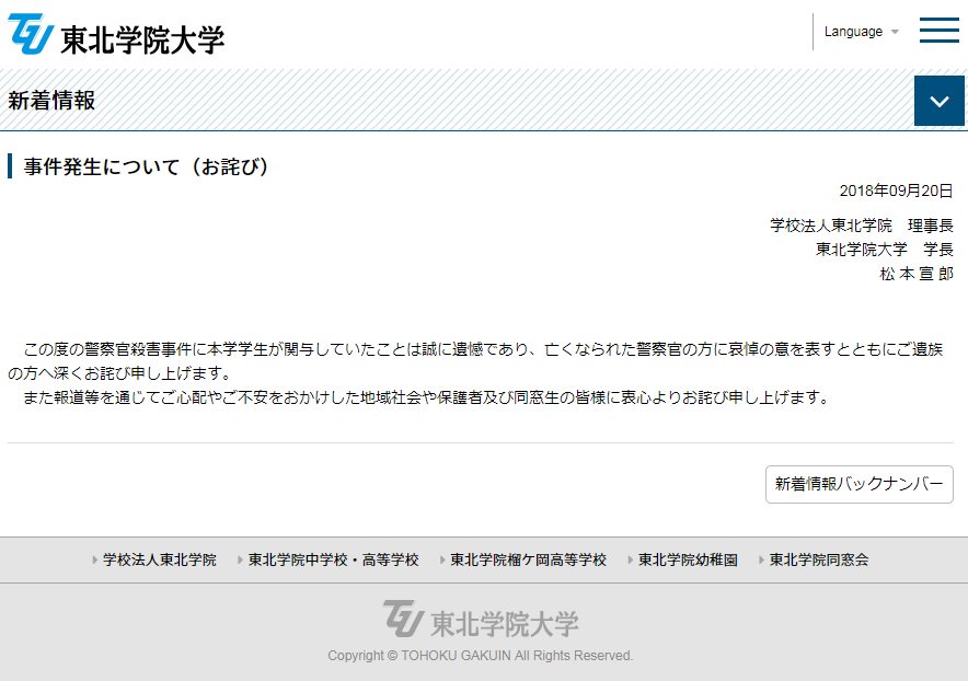 仙台交番襲撃事件、東北学院大学がホームページに「お詫び」掲載