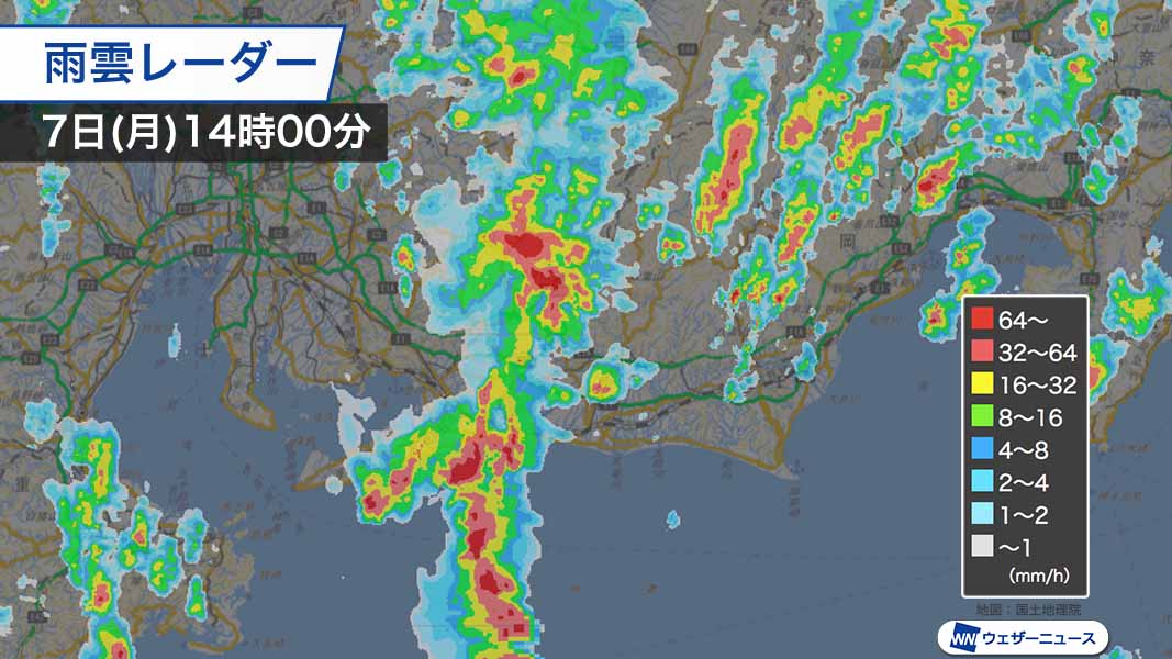 南北に伸びる活発な雷雲の帯が東海地方に激しい雨を降らせています。東海道新幹線は雨によって一時運転を見合わせ、ダイヤに乱れが出ています。
