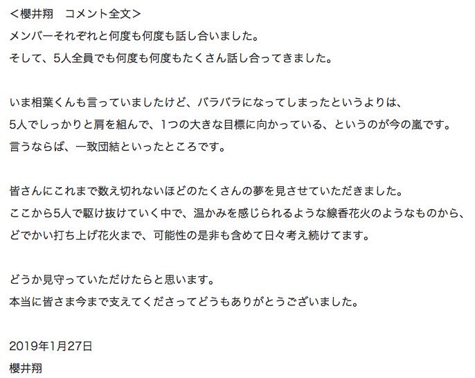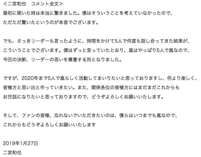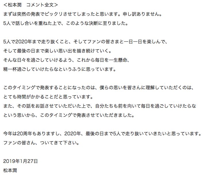 嵐、2020年をもって活動休止を発表【メンバ-5人のコメント全文】 ?大野智