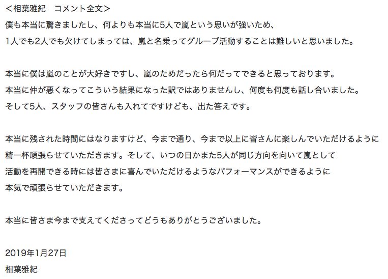 10000RT:【電撃発表】嵐の活動休止 相葉雅紀・松本潤・二宮和也・櫻井翔のコメント全文
