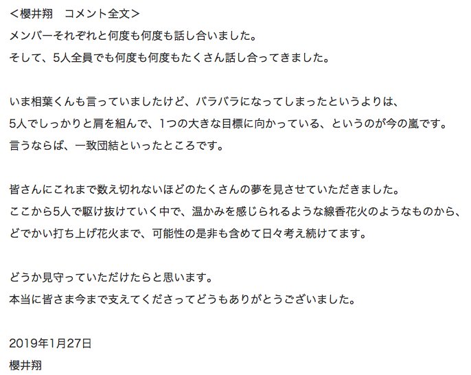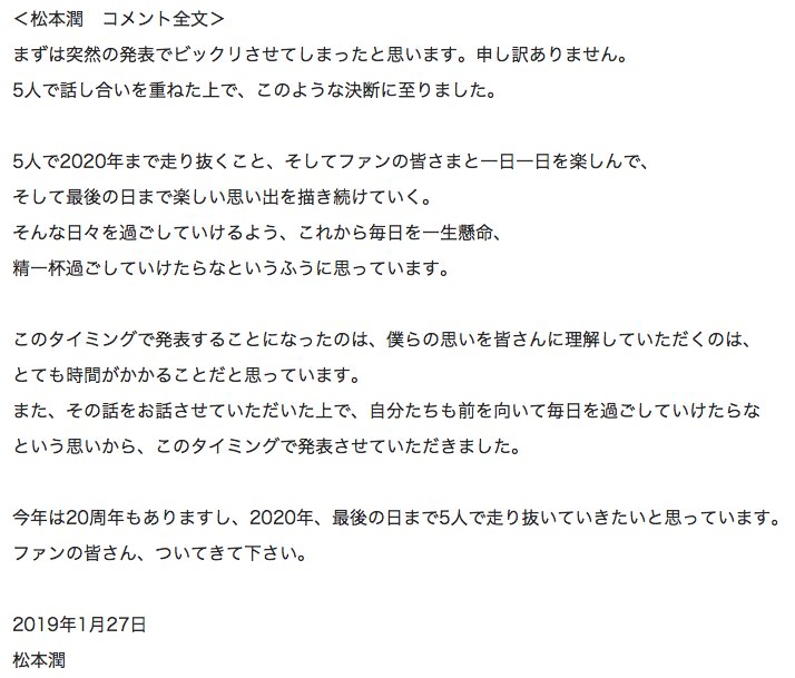 【5人のコメント全文】嵐、2020年をもって活動休止を発表 ?大野智