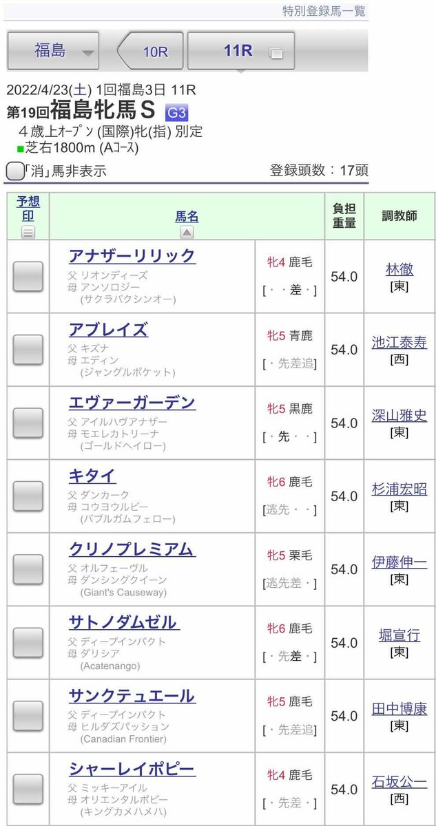 【#福島牝馬ステークス 登録馬】 アナザーリリック アブレイズ エヴァーガーデン クリノプレミアム サトノダムゼル サンクテュエール シャーレイポピー ジュランビル スライリー ハギノリュクス フェアリーポルカ ホウオウエミーズ…