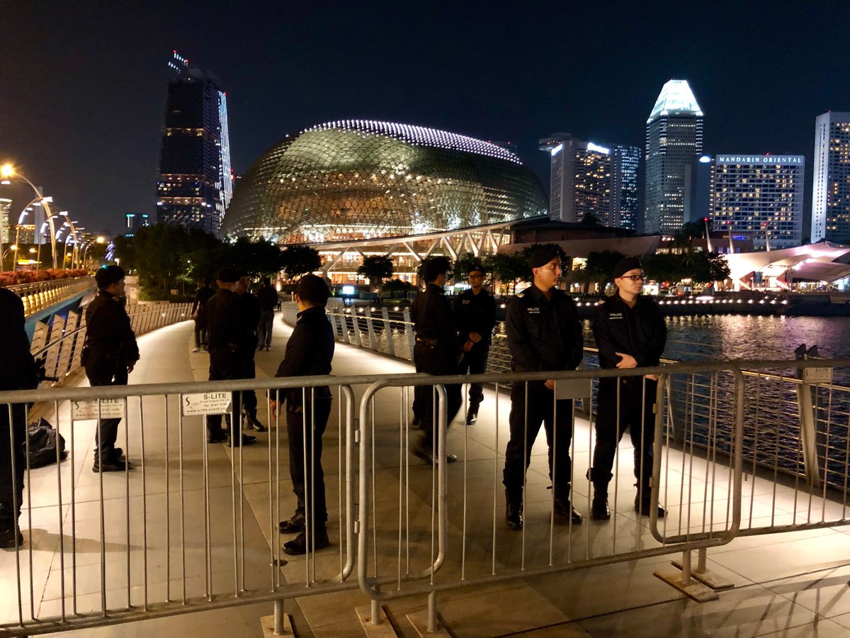 「マーライオン」があるマリーナベイにかかる歩行者用の橋が半分封鎖されました。警察官によると「セキュリティの関係で渡れない」とのことです。 #米朝首脳会談