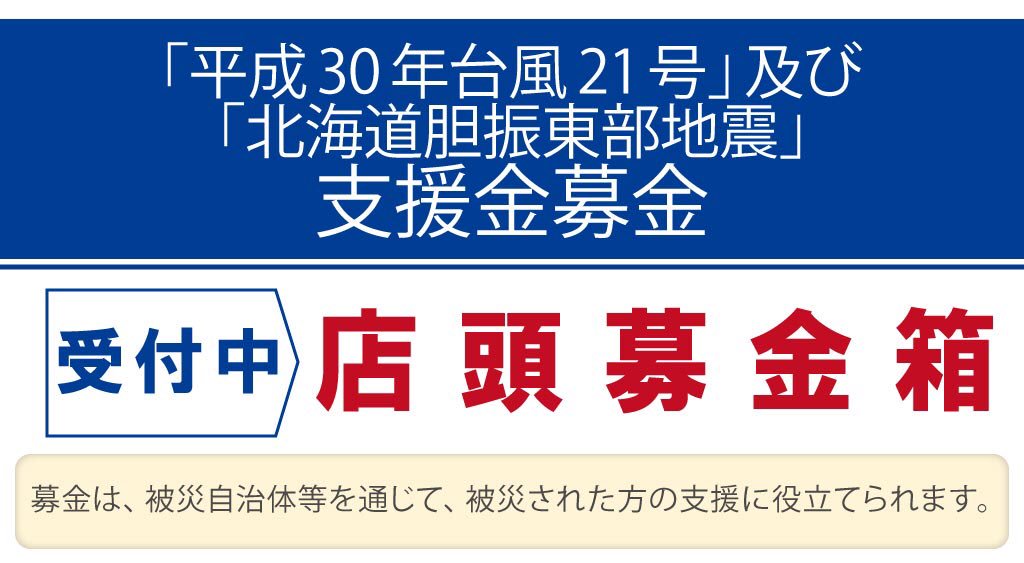 台風21号及び北海道胆振東部地震支援金募金の受付を始めました。レジ横の募金箱で募金できます。ご協力、お願いいたします。#ローソン#北海道胆振東部地震支援金