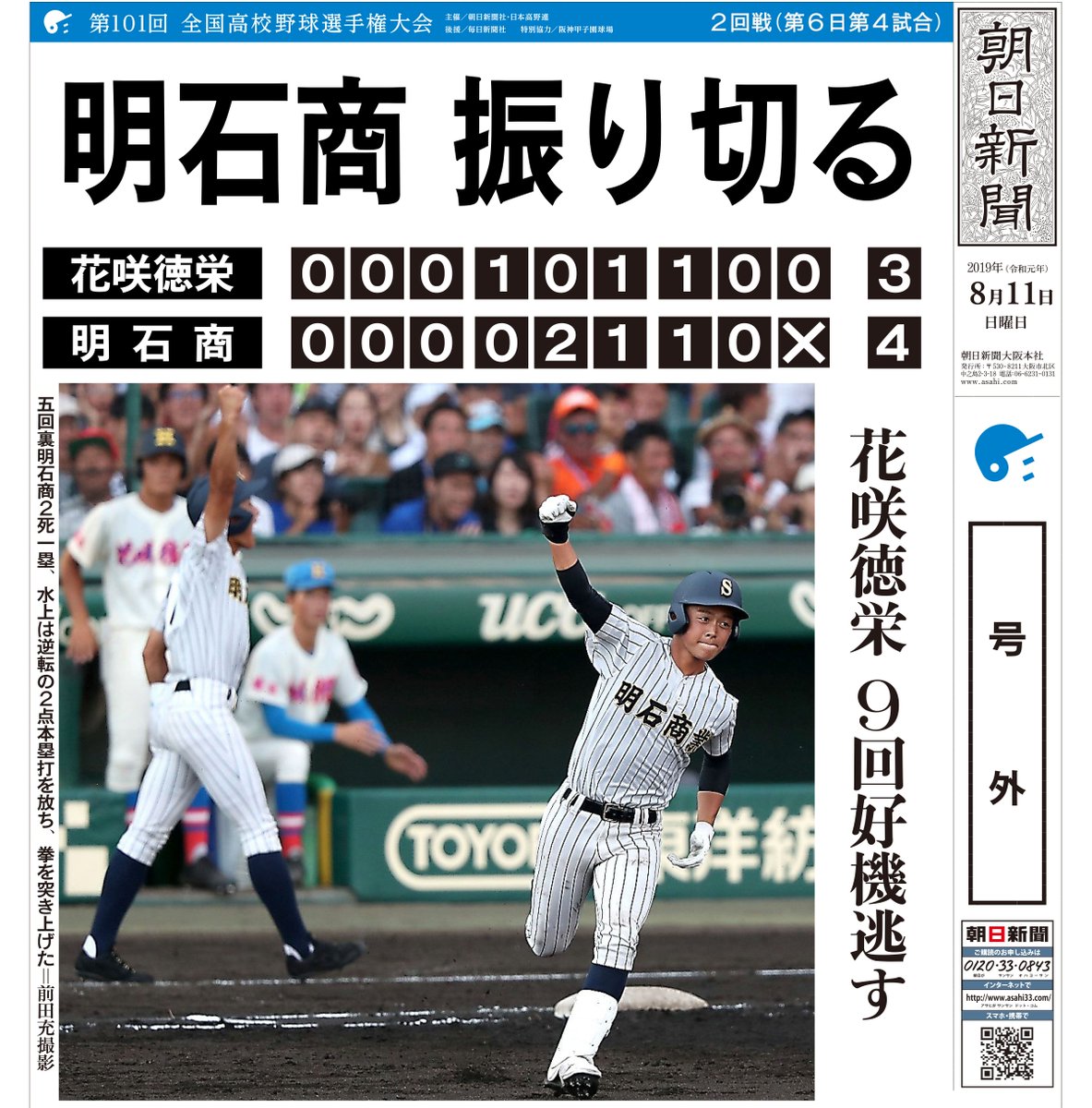 明石商、夏の甲子園初白星 花咲徳栄に4-3