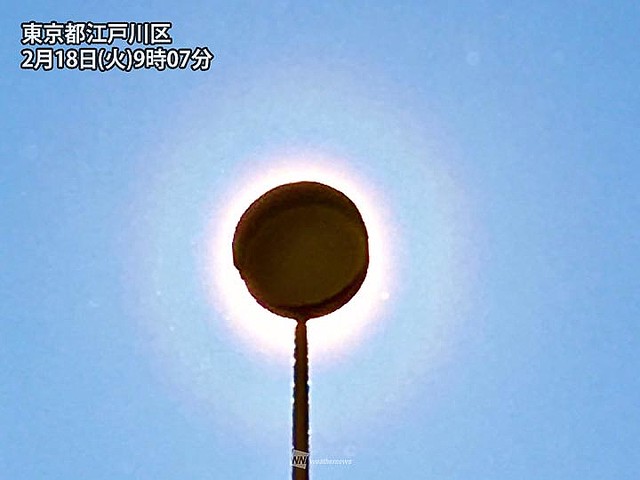 快晴の空が広がる関東で太陽の周りに虹色の環が出現しています。この原因となるのは、スギ花粉です。 #花粉光環