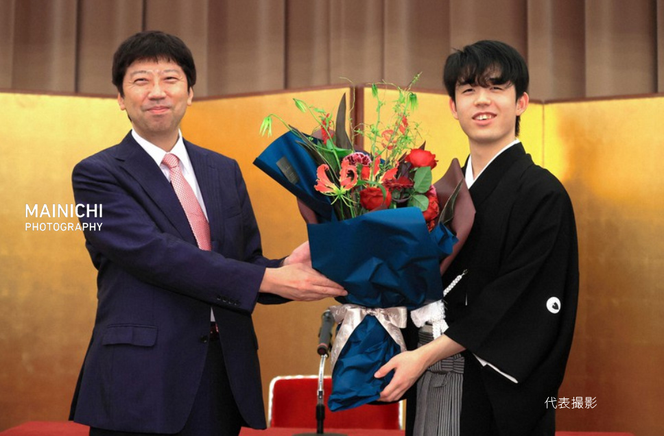 史上最年少で2冠を達成した藤井聡太王位の王位就位式が12日、東京都千代田区であり、師匠・杉本昌隆八段から花束を受け取りました 写真特集で
