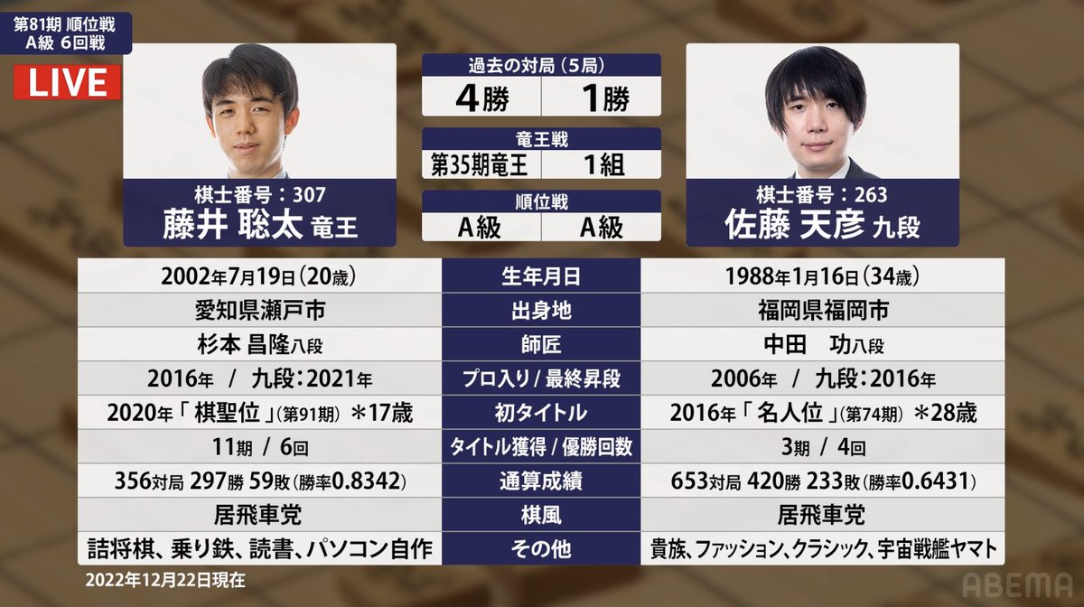 藤井聡太竜王のデビュー戦からちょうど6年ですね。