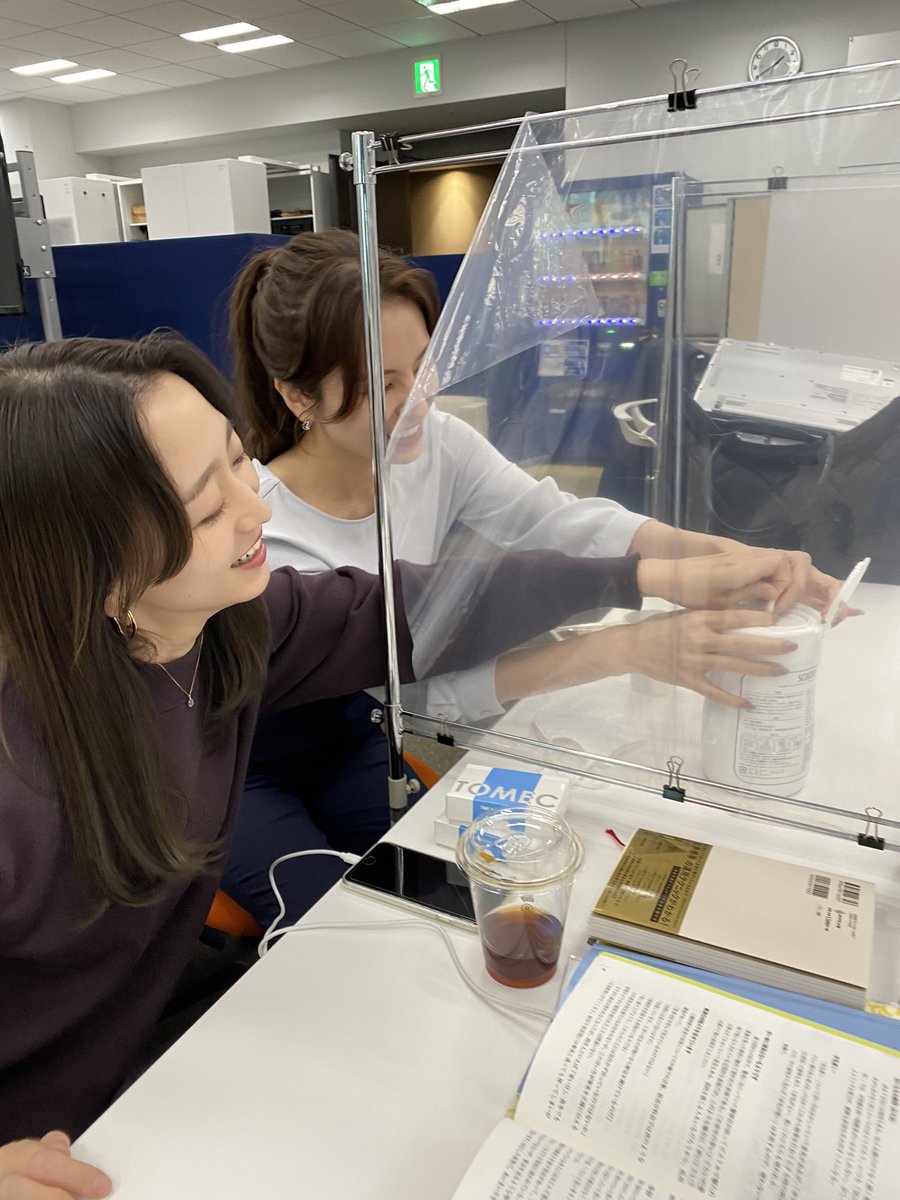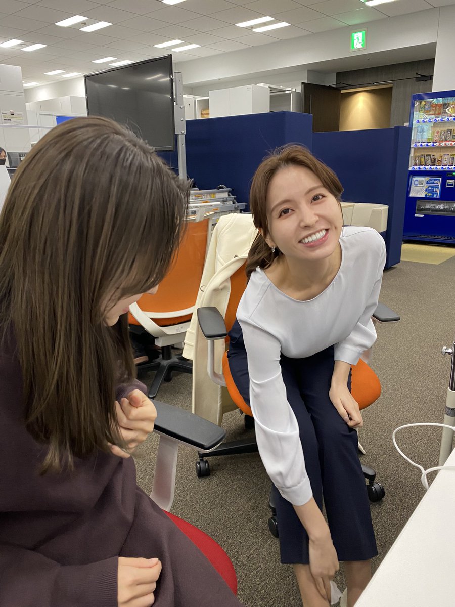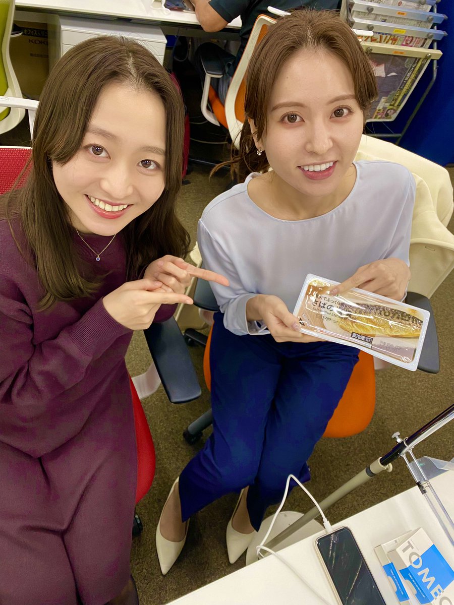 入社7年目 #片渕茜 アナと その1年年下の #角谷暁子 アナ? お昼の"サバ"とハイチーズ?の瞬間、サバが暴れて?大慌て!の図です。アナウンス部はしばらくサバの匂いに包まれていました?