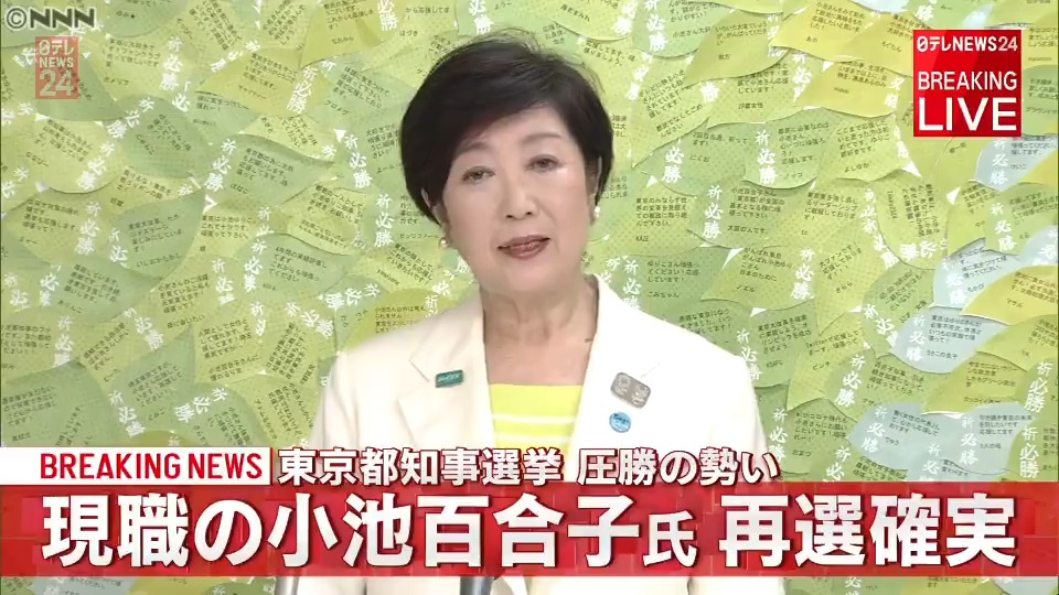 【再選確実の小池百合子氏がコメント】 小池氏「大切な2期目、重責を担っていく責任を感じる。都民ファーストの都政、東京大改革を進めた4年間に対しての都民の支持の成果かと思う」 #都知事選