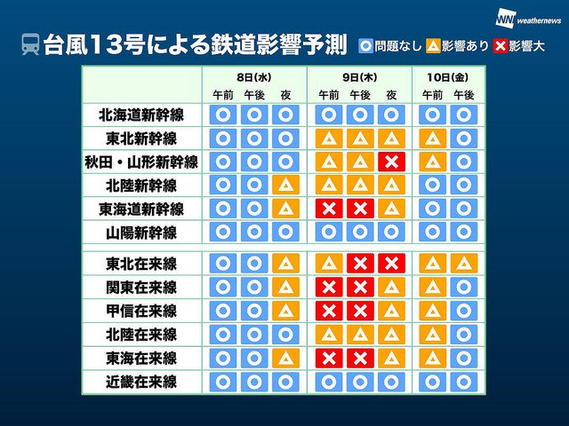 関東への直撃が懸念される台風13号。東日本や北日本では9日(木)を中心に鉄道のダイヤの乱れや高速道路の規制、飛行機などへの影響が広がりそうです。各交通機関ごとの影響予測をまとめました。(6日11時現在)…