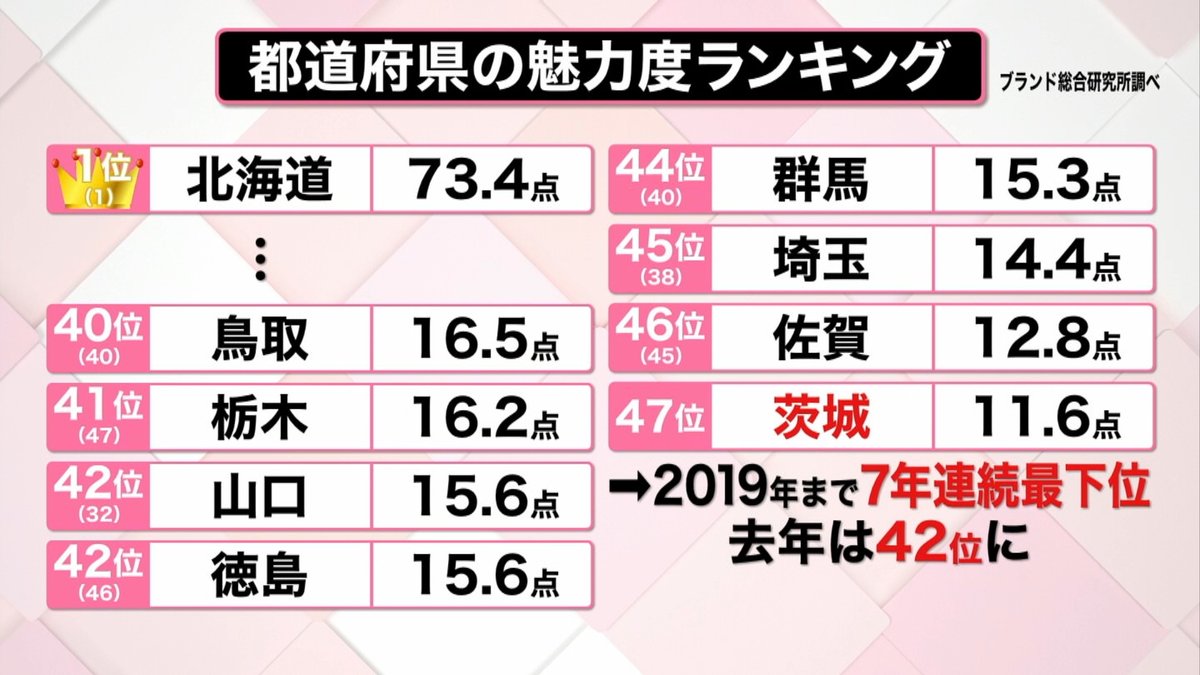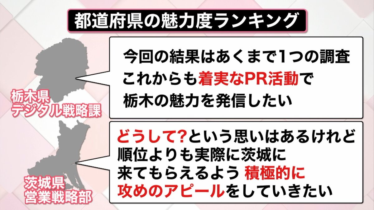 都道府県魅力度ランキング 茨城県が再び最下位に 1位は… 去年、最下位だった栃木県は順位を6つ上げて41位となりました。 全国の上位と下位の順位はこちらから ↓ ↓