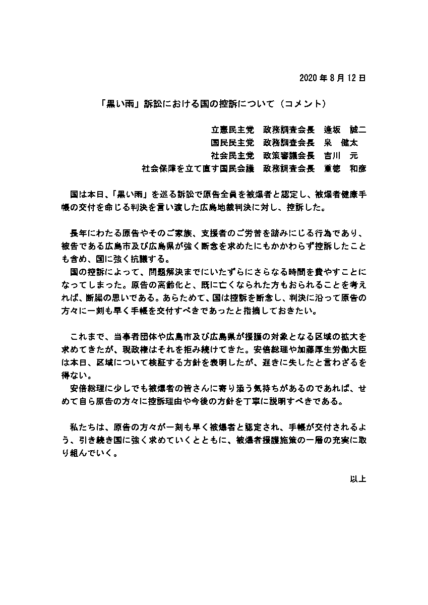 #国民民主党 の #泉健太 政務調査会長は12日、野党共同会派の政策責任者と連名で「黒い雨」訴訟における国の控訴について抗議するコメントを発表しました。 #黒い雨 #被爆者認定 #被爆者援護