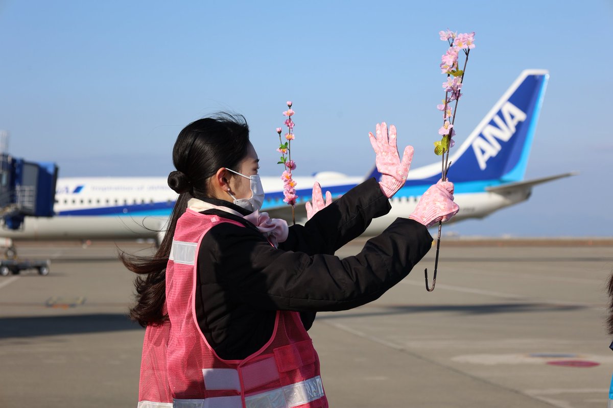 #ひな祭り ということでANA701便では桃の花や桃色の手袋でお客様をお見送り?この日ならでは、トリトンブルーと桃色の組み合わせが春らしさを演出してくれてます?#セントレア