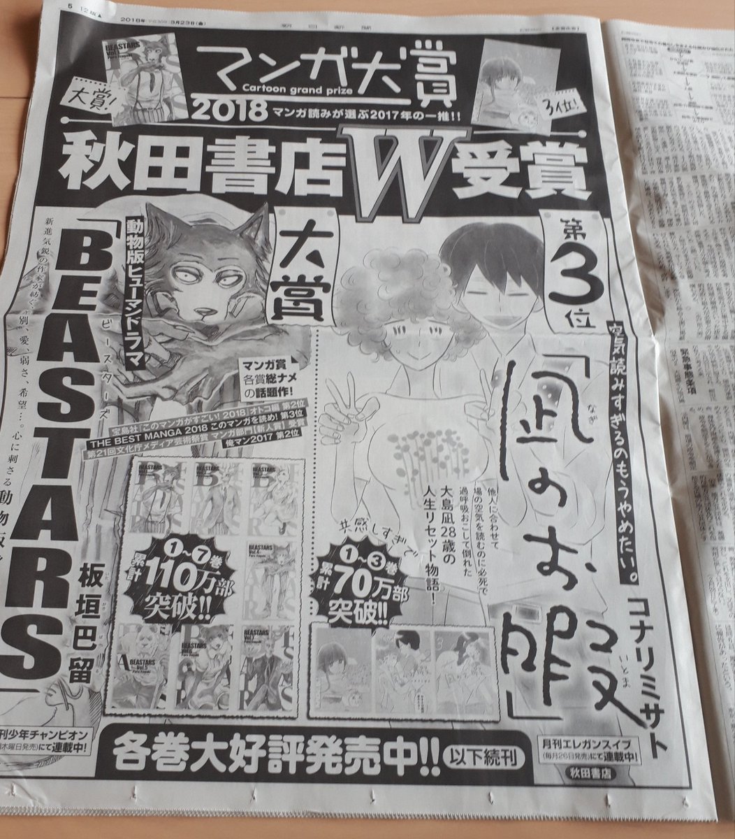 今日の朝日新聞朝刊に、「マンガ大賞2018」に選ばれた板垣巴留さん作「BEASTARS」と3位だったコナリミサトさん作「凪のお暇」(共に秋田書店)の全面広告が載っています。