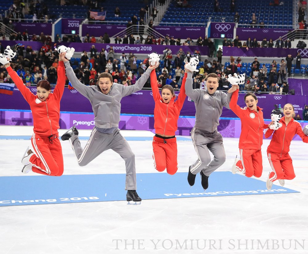 #フィギュア スケート団体で2位となりジャンプして喜ぶ「 #ロシア からの五輪選手」( #OAR )たち(12日、韓国・江陵で)=竹田津敦史撮影 #平昌五輪