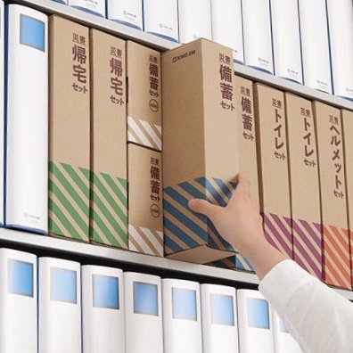 きょうは #防災の日 。文具メーカー・キングジムが考えたオリジナル防災用品「災害対策セット」はファイルと同じサイズ。本棚や引き出しに省スペースで収納できます。保存期間は6年。