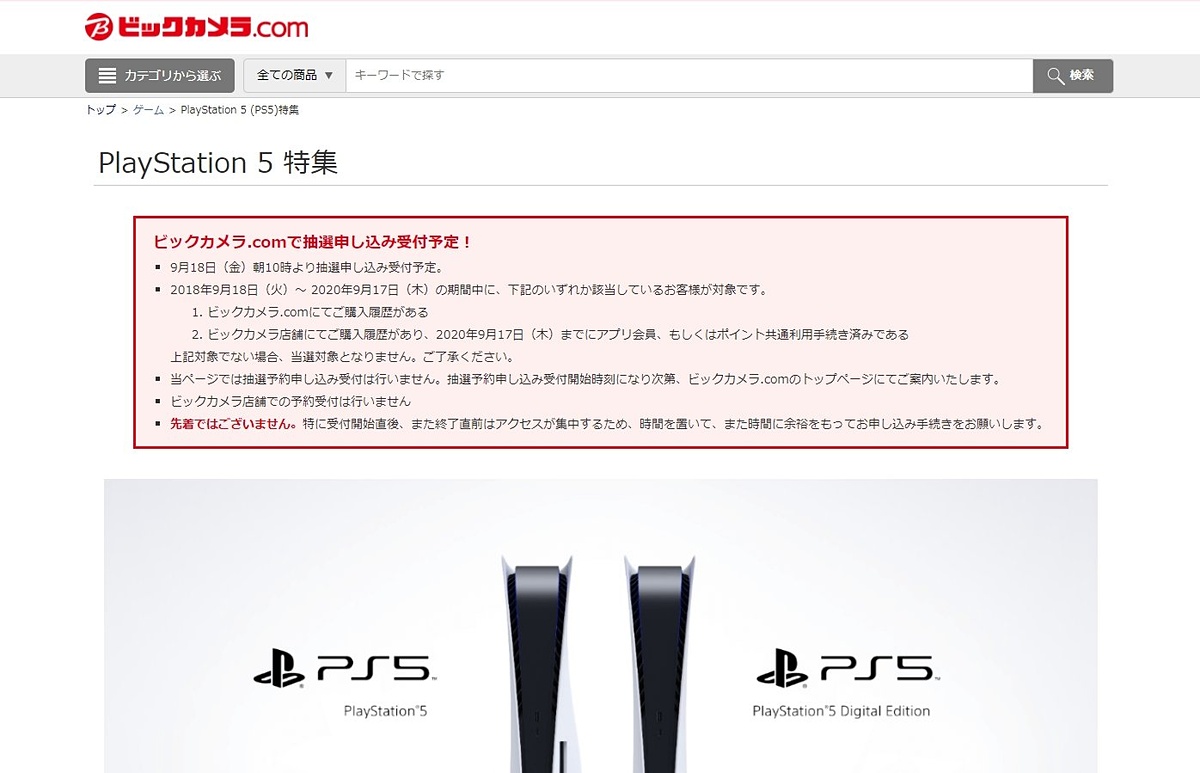 ビックカメラ、PS5の抽選申し込みを9月18日10時より実施 ビックカメラ店頭での予約受付は行なわず