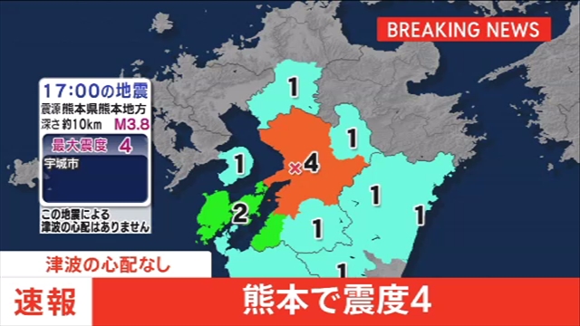 【熊本県で震度4、津波の心配なし】 午後5時00分ごろ、熊本県熊本地方を震源とする地震がありました。震源の深さはおよそ10キロ、地震の規模を示すマグニチュードは3.8と推定されます。この地震による津波の心配はありません。 #熊本県…