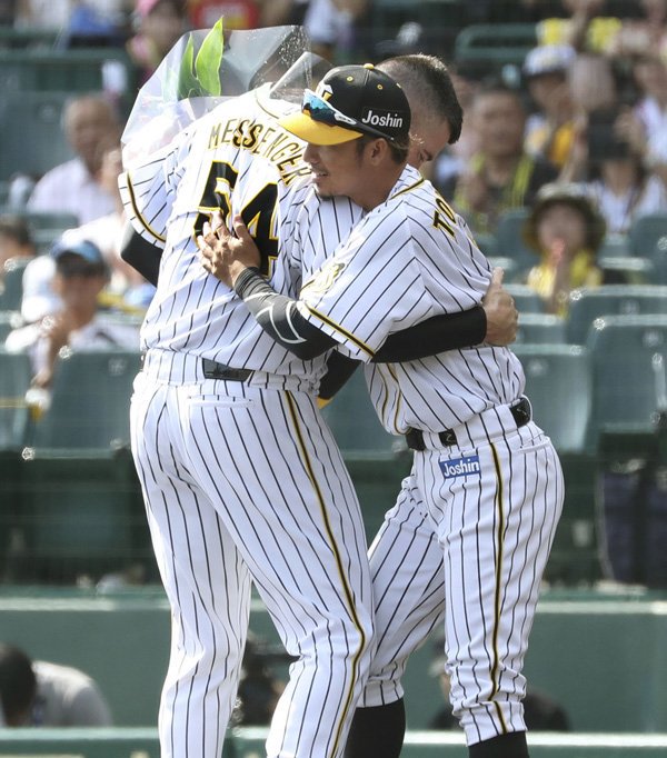 阪神・メッセンジャー投手が現役最後の登板。打者一人から三振を奪うと、鳥谷選手から花束?を贈られて阪神での10年間に幕を閉じました。 #