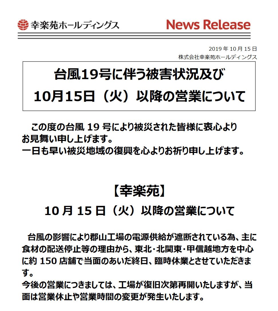これは仕方ない…… 幸楽苑、150店舗を当面の間臨時休業に 台風19号による工場の電源供給遮断で