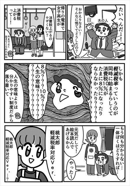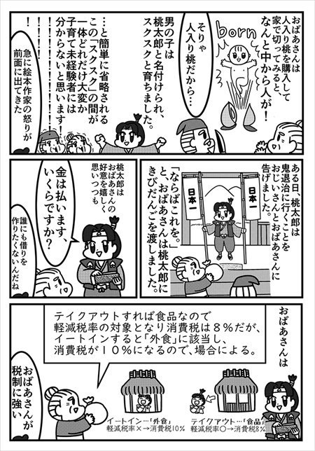 【再掲】とうとう明日なので…… 「きびだんごはテイクアウトなら消費税8%」 「桃太郎」で軽減税率を説明する漫画が「勉強になる」と話題