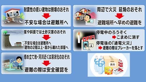 【イラストで確認・地震への備えは?】 落ち着いて自分の身を守る行動をとりましょう。
