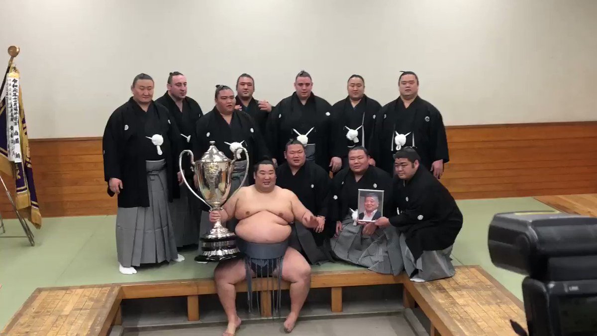 <千秋楽の様子> 支度部屋で、優勝した徳勝龍が一門の関取たちと記念撮影。 #