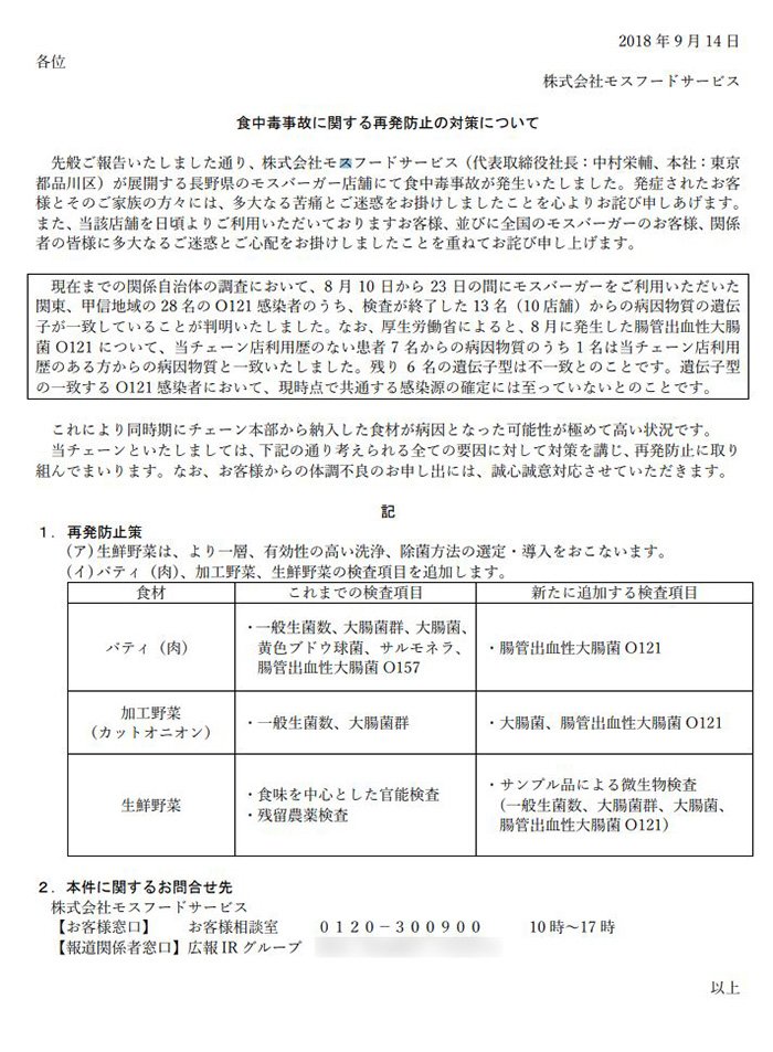 再発防止策を発表しました 「モスバーガー」利用者28人に食中毒症状 本部から納入した食材が病因となった可能性