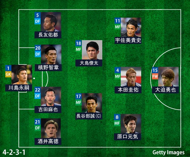 日本代表、スタメン発表! GK:川島、DF:長友、吉田、槙野、酒井高、MF:大島、長谷部、宇佐美、原口、本田、FW:大迫 速報⇒