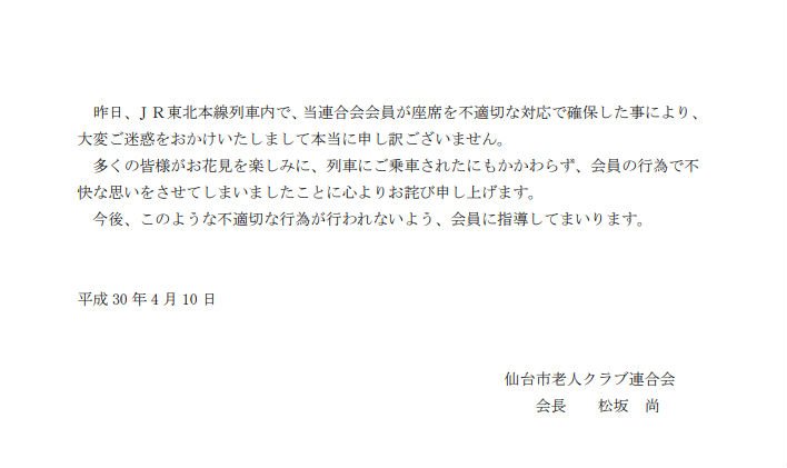 列車の座席に紙置き席取り 仙台市老人クラブ連合会が謝罪