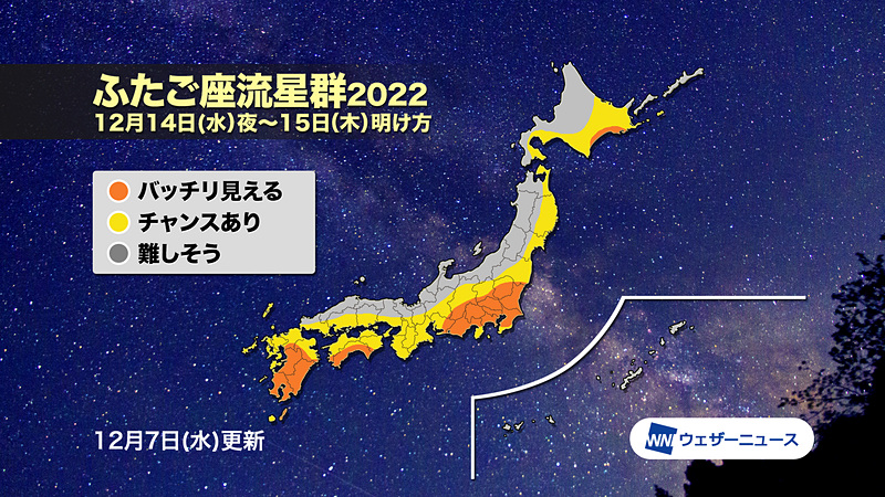 14日夜に極大の「ふたご座流星群」、東日本や西日本の太平洋側で好条件