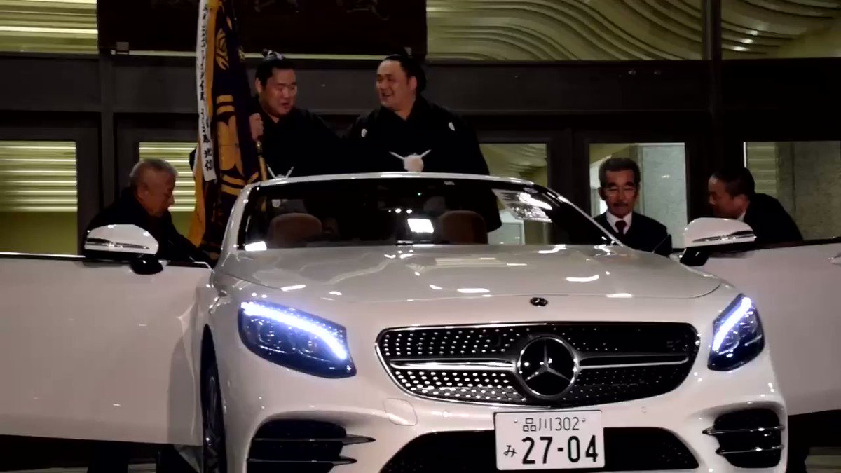 <玉鷲初優勝!>優勝した玉鷲は、オープンカーに乗って優勝パレード。旗手は輝。#