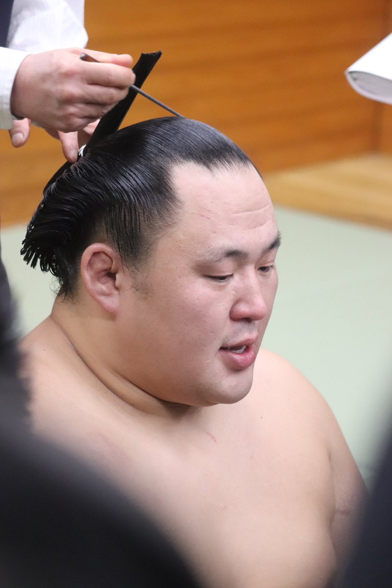 <玉鷲初優勝!>初優勝の玉鷲は、支度部屋で記者の質問に答える。#