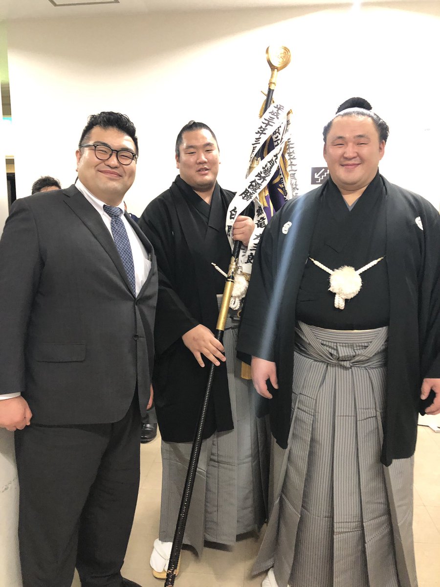 <玉鷲初優勝!>優勝パレードに出発する初優勝の玉鷲、旗手の輝、熊ヶ谷親方。#