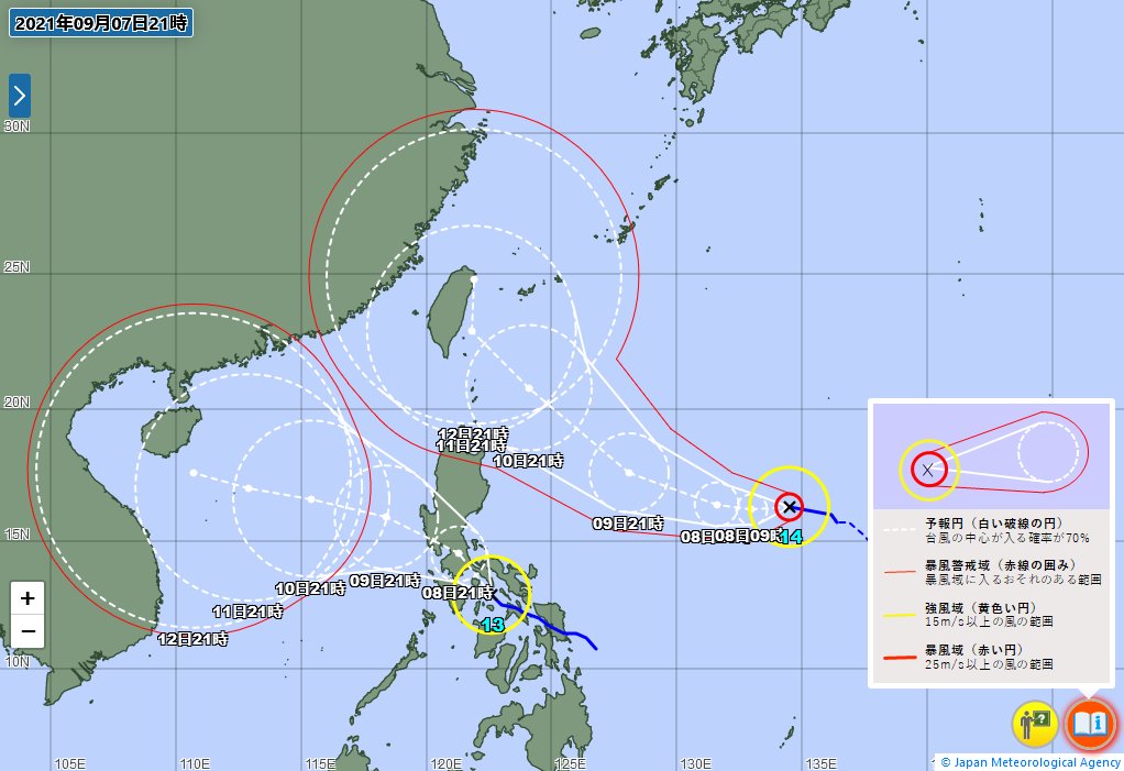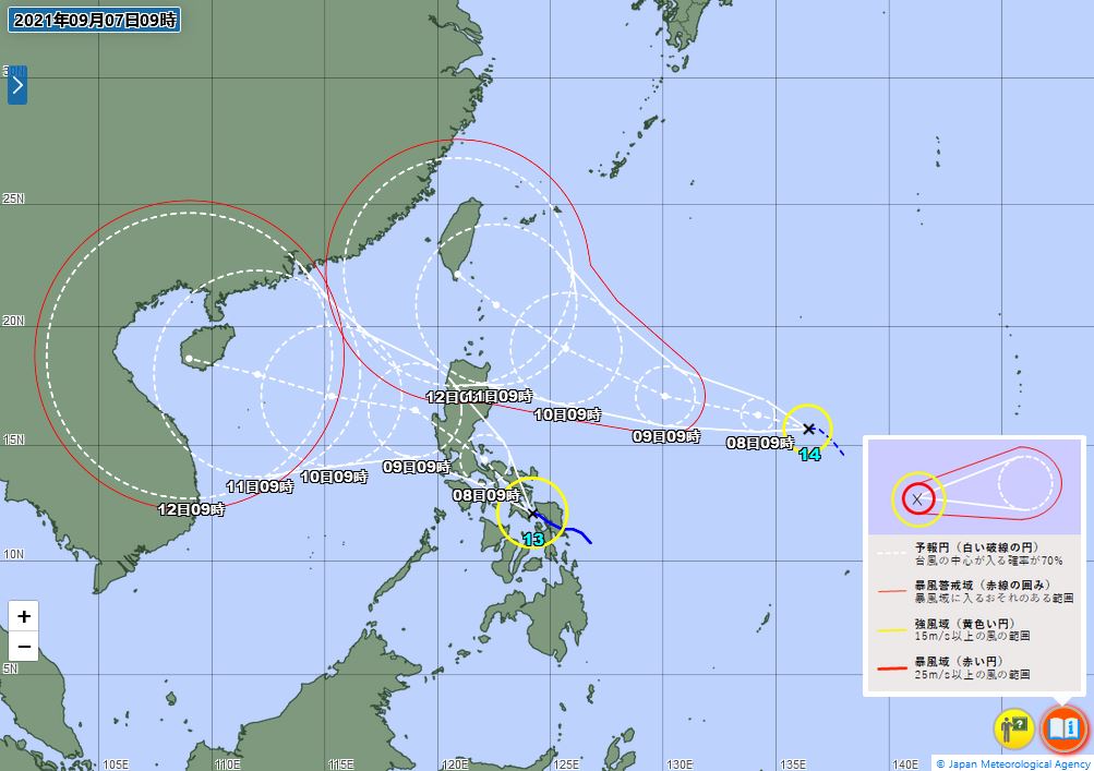 台風14号の動向にご留意ください。 台風はフィリピンの東海上を発達しながら進んでおり、8日には強い勢力、10日には非常に強い勢力になる予報です。南西諸島にも予報円がかかっています。最新の台風情報を確認するようにしましょう。