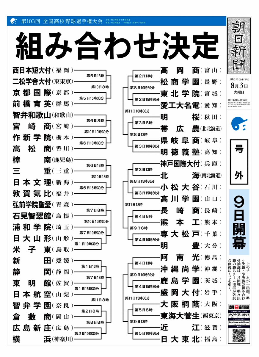 第103回全国高校野球選手権大会の組み合わせが決まりました。 大会は阪神甲子園球場で9日に開幕します。