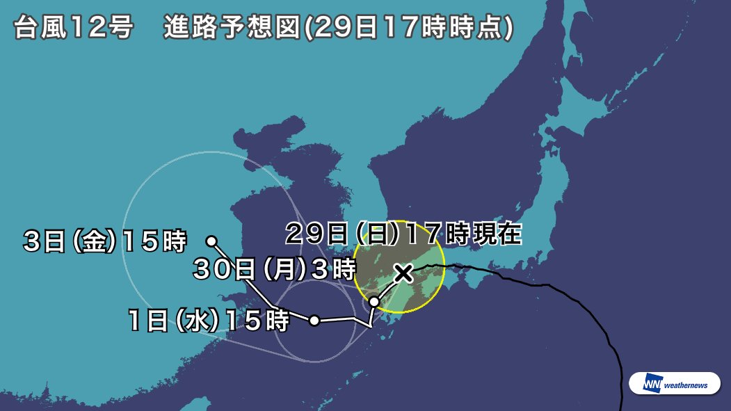 【台風最新情報】台風12号の中心は、29日(日)17時半頃に福岡県豊前市付近に上陸しました。今後、だんだんと南寄りへと進路を変え、九州南部の太平洋側を中心に大雨となる恐れがあります。
