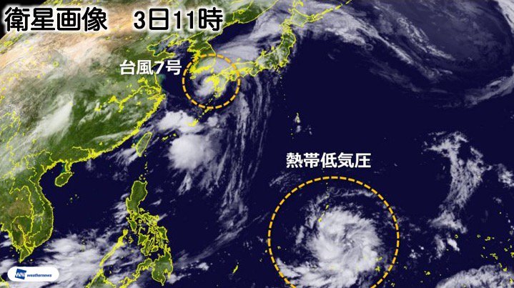 【今日の天気】3日(火)は台風7号が九州の西の海上を北上し、接近します。九州や四国、中国の一部では風雨の強まる恐れがあるため警戒が必要です。 また、東日本では猛暑が継続するため、万全の熱中症対策を心がけて下さい。…