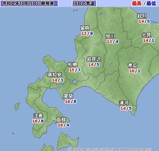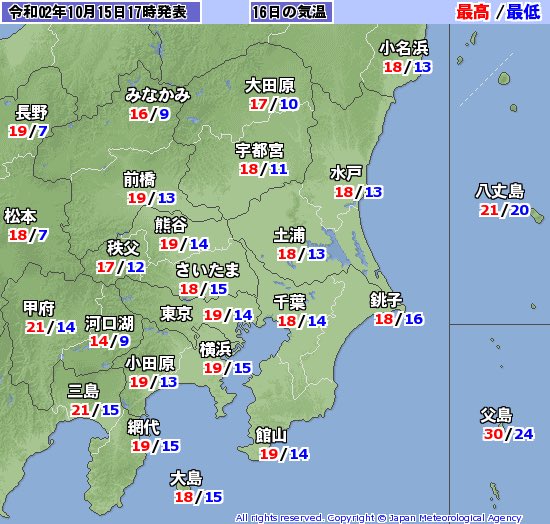 あす16日も冷えます.東京都心は最低気温14℃で帯広では1℃.最高気温は20℃いかなさそう. あさって土曜日17日はもっと冷えます.東京都心で最低気温11℃で,最高気温は14℃予報. あたたかくしてお過ごしください.