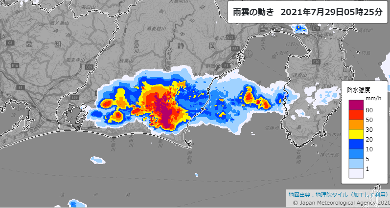 【静岡県で記録的短時間大雨情報】 5時10分までに 静岡県菊川市付近で約110ミリ 非常に発達した雨雲がかかっています。 浸水害に気を付け、高いところに避難するようにしてください。 土砂災害にも警戒を! #大雨 #静岡県 #菊川市