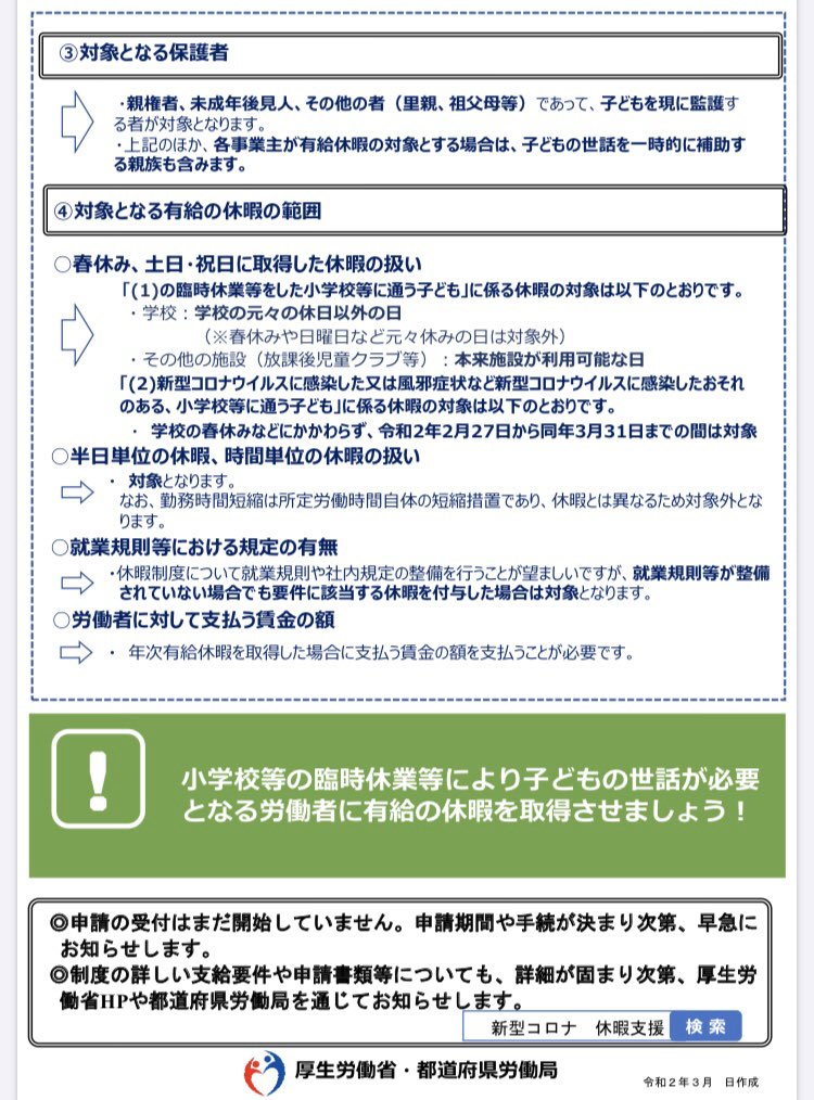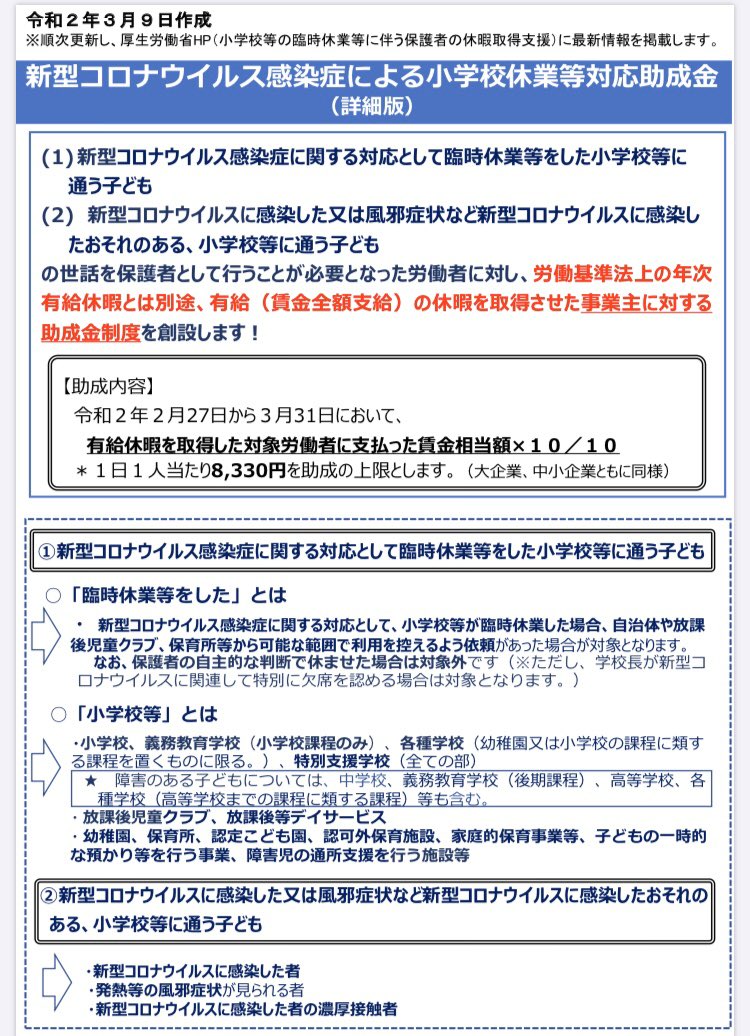 学校休業による休業補償は、親だけでなくじいちゃん、ばあちゃんなどもOKに。この点は評価。周知徹底しよう。しかし上限金額(8330円)の撤廃と、フリーランス等の休業補償(別制度)が全く不十分な点は引き続き強く要望していく。